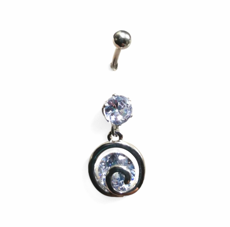 Piercing pentru buric din inox, cu zirconiu cubic strălucitor și pandantiv elegant în formă de spirală.
